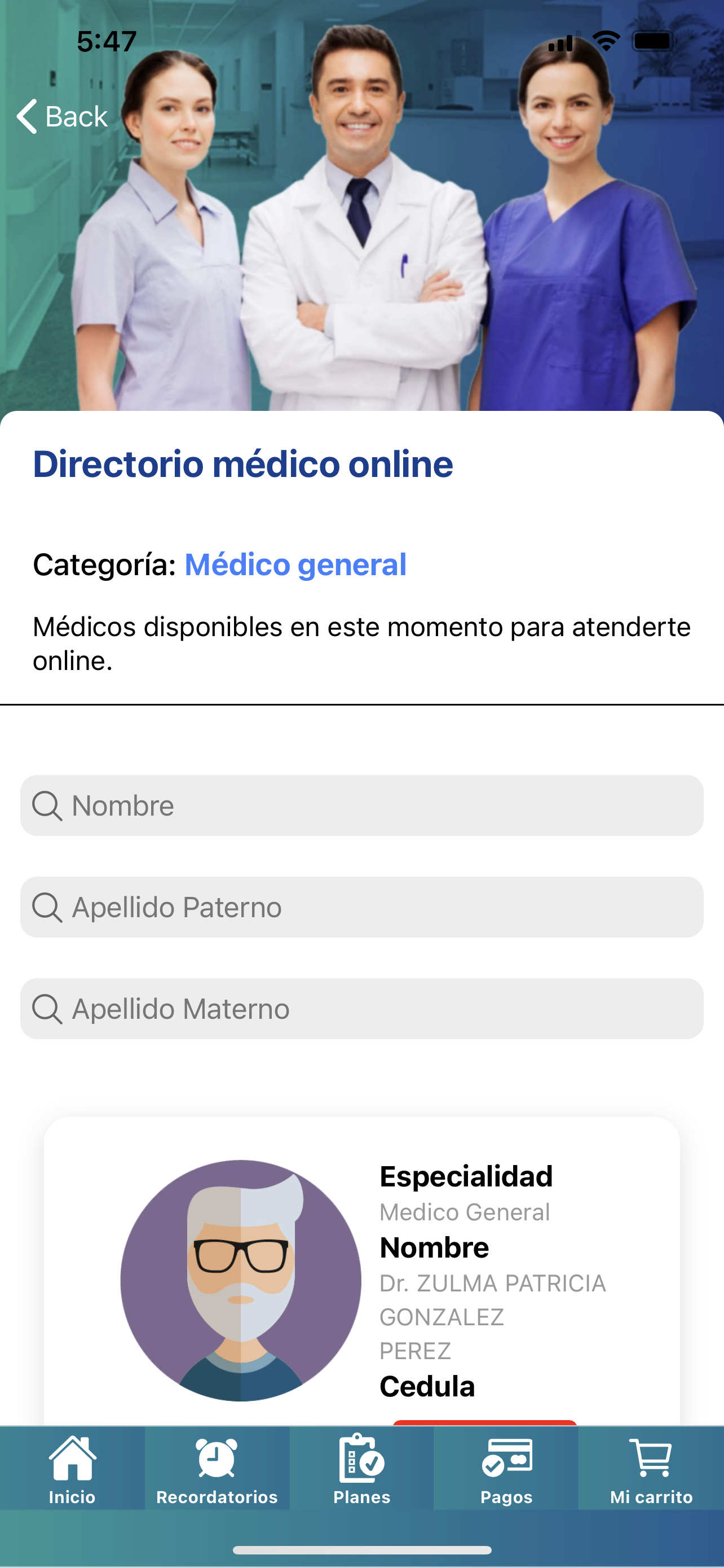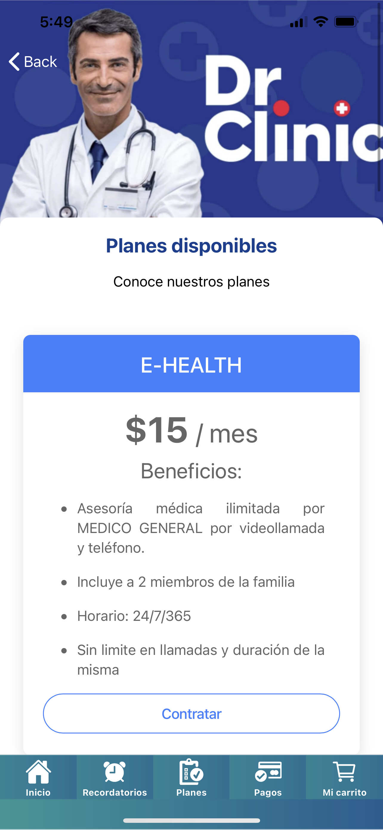 Con DrClinic tendrás asesoría médica a distancia con un solo clic, accediendo a nuestros médicos y especialistas. Ten acceso a nuestro equipo de médicos y especialistas desde tu celular por medio de videollamada o llamada de manera ilimitada. Contamos con diferentes especialidades médicas como pediatría, oncología, cirugías, nutrición, entre otros. Con un solo clic podrás consultar farmacias cercanas a tu ubicación, para poder contactarlas rápidamente y solicitar tus medicamentos. Con unos clics puedes agendar una consulta presencial con nuestros médicos, además tener descuentos en diferentes tipos de consultas. Si presentas alguna urgencia médica, con el botón de SOS recibirás atención de manera inmediata con nuestro equipo de expertos. Tu salud es lo más importante, es por eso que nuestra red de médicos atiende las 24 horas del día los 365 días del año. En unos simples pasos puedes tener consultas ilimitadas por videollamada o llamada, así como agendar consultas presenciales con nuestros médicos o especialistas. Con DrClinic tu Familia estará protegida, nuestros planes cubren de 2 a 5 miembros por plan con atención ilimitada con Médicos Generales. Más de 16 millones de clientes confían en nosotros, brindándoles la mejor atención y un excelente servicio médico. SIN PLAZOS FORZOSOS Cada Plan ofrece diferentes beneficios para ti y tu Familia, la primera vez que descargas DrClinic el uso de los servicios es GRATIS *. Asistencia Médica Ilimitada Consultas con Médicos Generales Hasta 2 miembros de la Familia Consulta por videollamada y teléfono Asistencia Médica Ilimitada Consultas con Médicos Generales y Especialistas Hasta 5 miembros de la Familia Consulta por videollamada y teléfono Consultas presenciales incluidas Descuentos en servicios Atención en Ginecología y Pediatría Asistencia Médica Ilimitada Consultas con Médicos Generales y Especialistas Hasta 5 miembros de la Familia Consulta por videollamada y teléfono Descuentos en servicios Atención en Ginecología y Pediatría Obtén información detallada de nuestros Planes 1 Entra a tu tienda de Apps de tu dispositivo (App Store o Play Store), busca DrClinic y haz clic en instalar. 2 Una vez instalada la App, te pedirá iniciar sesión, si aun no te registras podrás crea tu usuario. 3 DrClinic es gratis el primer mes, una vez finalizado puedes seleccionar tu plan y pagar desde la App. Haz clic para descargar la App La Salud de los pequeños es lo más importante, consultas médicas y asesoría en Pediatría. Contamos con servicios adicionales como cirugías y curaciones para diferentes situaciones. Nuestros planes ofrecen asesoría médica ilimitada en consultas de Ginecología. Limpieza dental sin costo en clínicas de convenio y descuentos en tratamientos. Ofrecemos diferentes tipos de análisis de laboratorio, todos a un clic de distancia. Consultas de nutrición por videollamada y con descuentos especiales de 40%. Descuentos en estudios de rayos x, tomografías, ultrasonidos, entre otros. Consulta con nuestros médicos especialistas en Oncología Pediatrica. Envíanos un mensaje si tienes duda de nuestros servicios médicos. PLANES ACCESIBLES Y COMPLETOS Desde tu Smartphone o Tablet, de cualquier forma puedes acceder a nuestros servicios médicos. Contamos con un equipo de médicos y especialistas expertos en diferentes áreas de medicina. En DrClinic encontrarás una gran variedad de servicios médicos, consultas y tratamientos. Amplia red de colaboradores con los mejores servicios médicos y precios muy accesibles. 4.97 Lo más importante para nosotros es la satisfacción de nuestros usuarios, en DrClinic buscamos ofrecer servicios médicos de calidad desde la palma de tu mano. Los precios de los planes son muy buenos, empecé con el básico y ahora toda mi familia está protegida. Excelente App, me encanta que puedas agendar tus citas y pedir medicamentos desde tu celular. Fácil de usar, un excelente directorio médico y un muy útil botón de pánico. Es increíble la facilidad y rapidez con la cual puedo obtener asesoría médica, excelente servicio de sus médicos. Recomiendo mucho esta Aplicación, cuenta con una red de médicos expertos, los mejores servicios y grandes descuentos. Ponemos a tu disposición nuestros diferentes medios de contacto: Tu Doctor en tu Celular